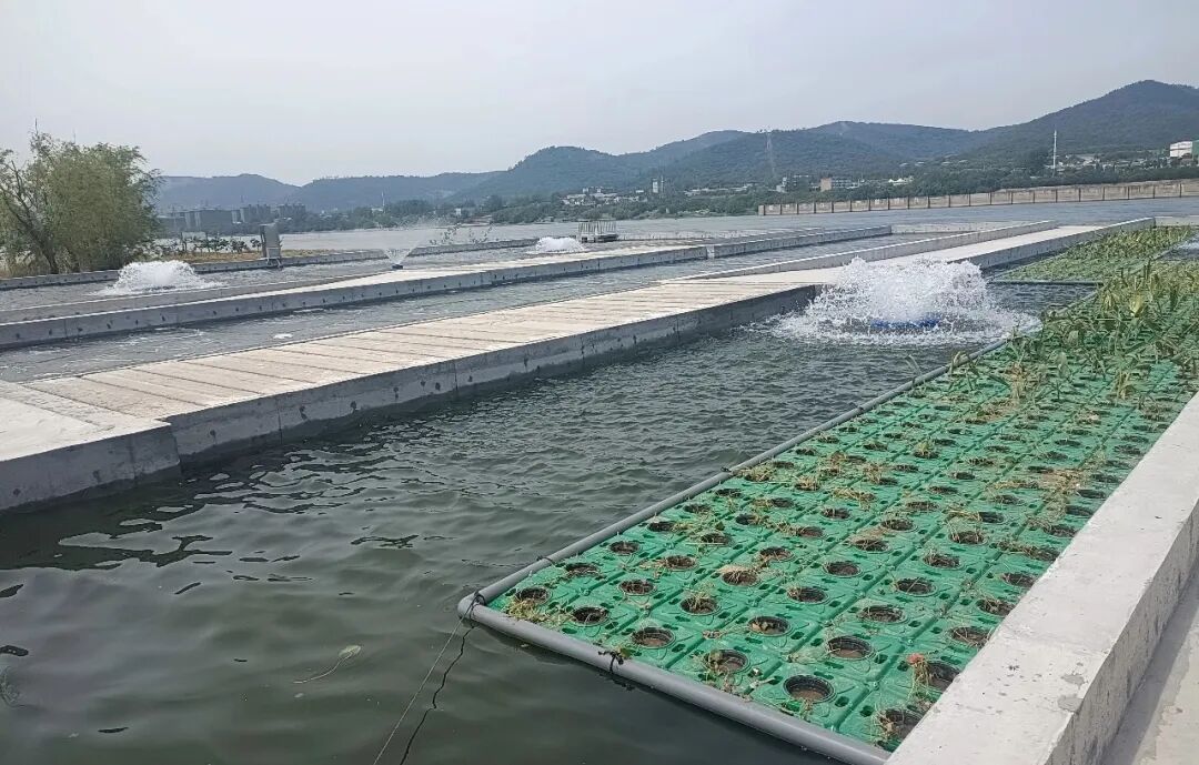 为了坚持“绿色”发展理念,在项目规划设计阶段,崔家营公司就邀请了行业专家和设计单位现场调研,提出了“三池两坝”的建设方案。鱼类繁育孵化的尾水通过沉淀池自然沉降后经过第一道过滤坝进入曝气池,在曝气池内通过纳米气盘充氧分解后再经过第二道过滤坝最后流至生物净化池完成三级过滤,尾水达标后再进行环境绿化等用途。项目建设过程引入了“生态浮岛+沉水植物”的同时,并在生物净化池内投放了白鲢、鳙鱼、湖蚌等水生动物构成生态链,在水面增设了喷泉式曝气机,不仅有效地提升了水质处理效果,并达到了景观效果。